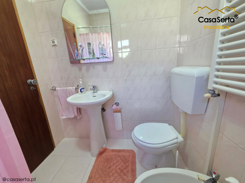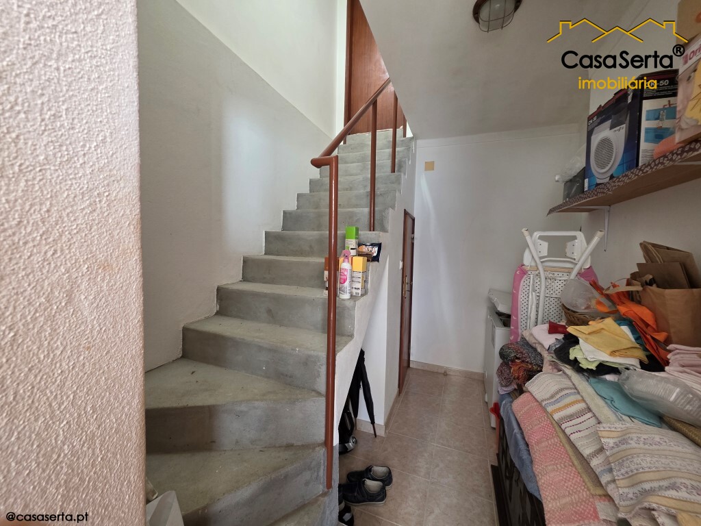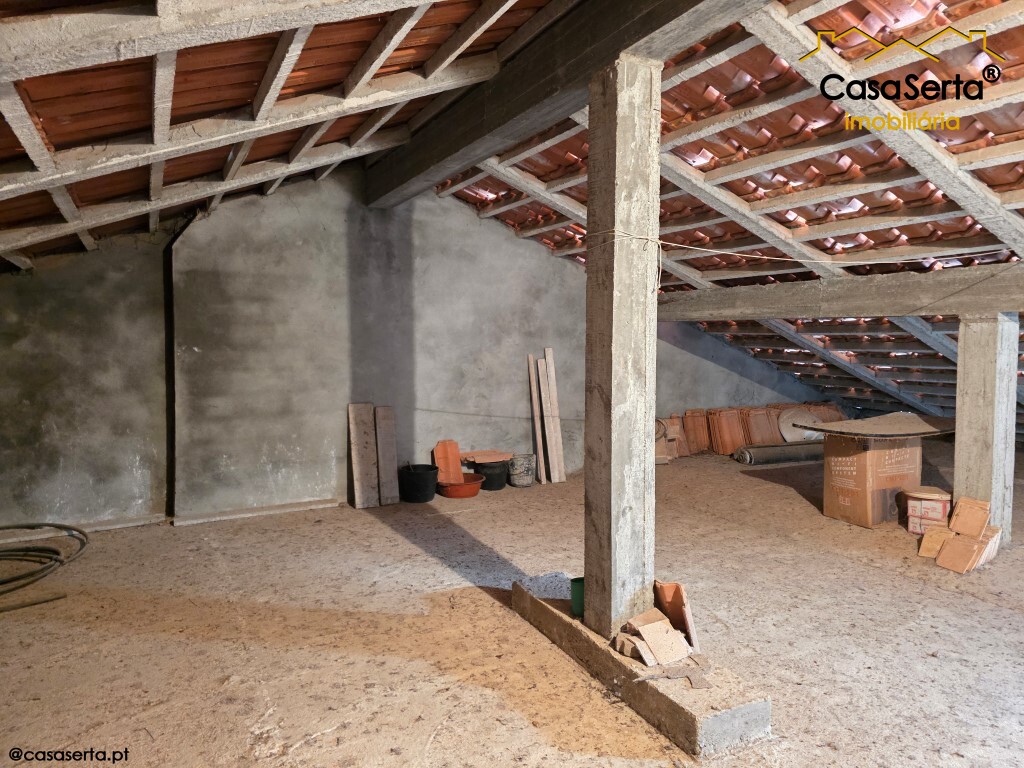 Ao nível do 1º andar a casa dispõe atualmente de dois quartos, podendo criar um terceiro num espaço junto á varanda, uma casa de banho social, cozinha equipada, sala de estar e sala de jantar.